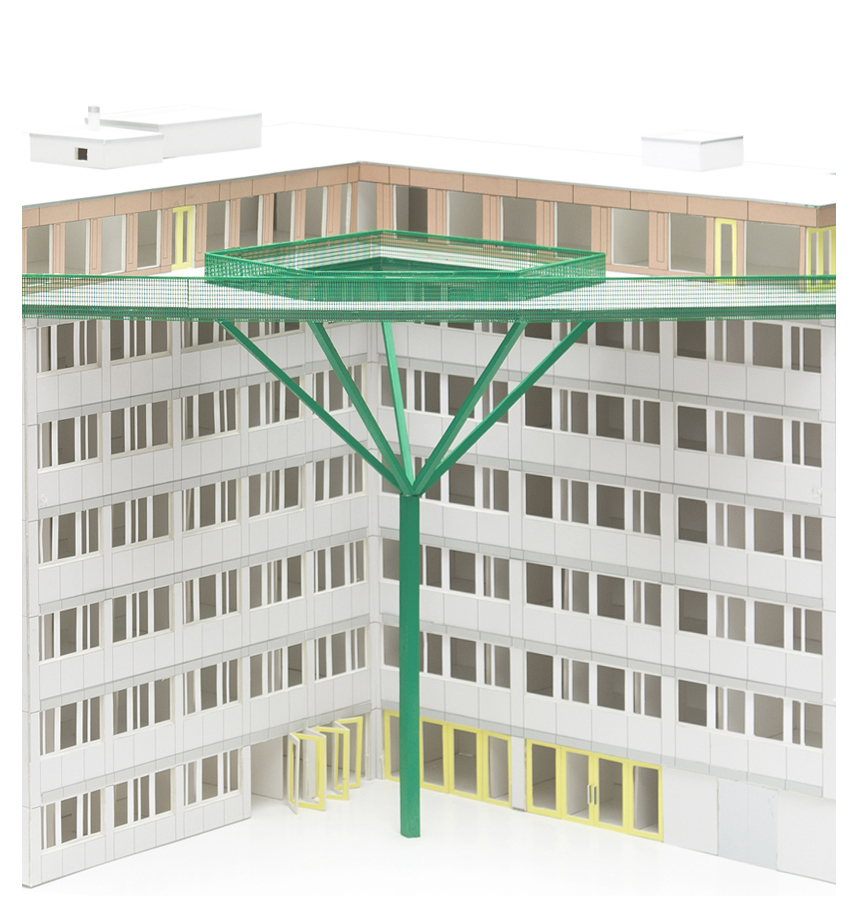 The extension of the rooftop terrace transforms the pragmatic top floor into a rich terraced world. With its balustrades overgrown with a curtain of climbing plants, the new sun deck meanders like an Islamic garden around the existing rooftop structures. This gesture gives the vertical annexes the look of being pavilions in the midst of a hanging garden, its character formed in unison with the green fingers of the residents and their desire to shape their surroundings. Overgrown pergolas provide shade and arrange the rooftop landscape into a place of togetherness, encounter, and retreat. The ground floor with a café and co-working and studio spaces opens up to the urban surroundings. It is embedded in an opulent garden with shaded trees, shrubs and fragrant flowers.