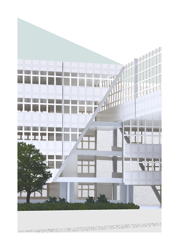 Ein zentraler Boulevard erschliesst die Klassen- und Fachzimmer auf leicht verständliche Weise und dient gleichzeitig als Erweiterung der Unterrichtsfläche. Die Mitte der neuen Schule wird vom einem Podiumsgeschoss gebildet, wo sich die Mensa, der Musik- und der Mehrzwecksaal befinden. Das Podiumsgeschoss wird zu einer richtiggehenden Piazza für die Schulgemeinschaft aus Schülern, Lehrern und Eltern für Projekttage, Veranstaltungen oder Feste. Ausserdem wird es über einen direkten Eingang von der Passerelle erschlossen, die sich als zeichenhaft-farbige Stahlkonstruktion mit der Schule zu einer urbanen Figur verbindet. Die inneren Teilungen sind so transparent wie möglich ausgebildet und schaffen eine Atmosphäre der Kommunikation und Offenheit bei gleichzeitiger Robustheit.
